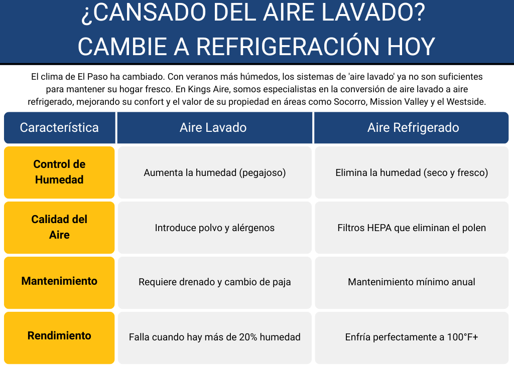 Muchos clientes en El Paso nos preguntan si el costo vale la pena. La respuesta es sí. Un sistema de refrigeración moderno (SEER2) no solo usa menos electricidad durante los picos de calor, sino que elimina el gasto constante de agua y reparaciones de bombas de los sistemas viejos. Además, ofrecemos opciones de financiamiento flexibles para que su familia no tenga que sufrir el calor este verano.
